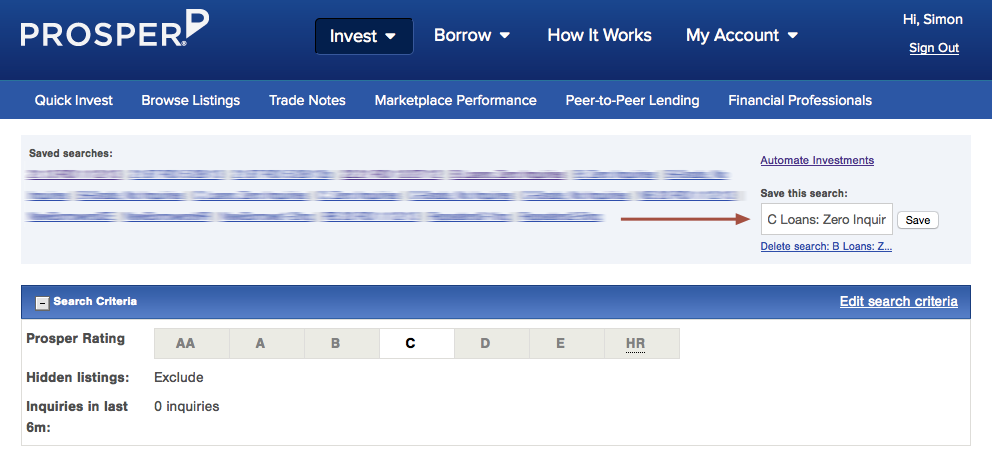To create a saved search, select your risk tolerance through choosing one or more Prosper Ratings (AA-rated are safest, HR-rated are riskiest). The level of risk you choose is one of the more important decisions you will face in peer to peer lending. Read more about it here: “Risk Tolerance 101: Which Loan Grades Should I Choose?“. You can also add additional filtering factors (like excluding borrowers with a recent inquiry) through the Additional Criteria link.