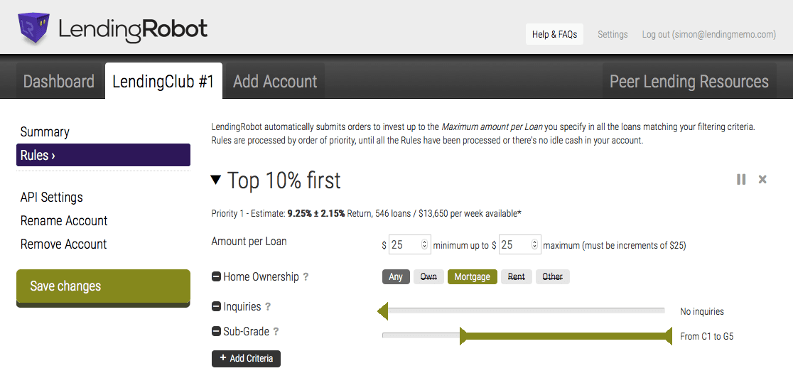 Setting up a LendingRobot account is super easy. Once your Lending Club account is linked with an API key, you just go to the Rules area of your account and choose your filtering variables. I’ve set up LendingRobot with the filter we’ve been using in this article today (Grades: C-G, Inquiries: 0, Home ownership: Mortgage). If I enabled this filter, LendingRobot would automatically invest with it the moment Lending Club adds new loans to their platform.