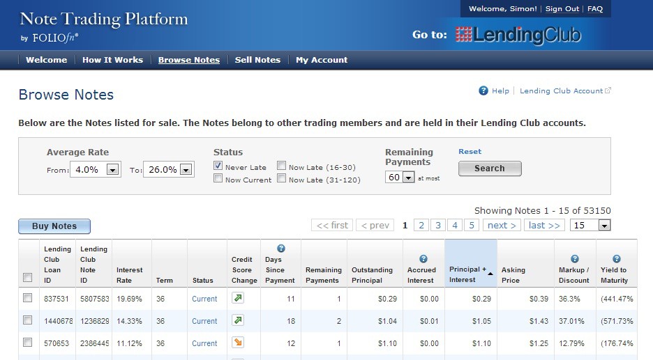 You can access the secondary market through Lending Club’s Trading Account link. Many lenders have had success this way, but many have also been frustrated by it. In short, the Foliofn interface is really rough at both Lending Club and Prosper. It might be good enough for some, but many serious Foliofn investors have found success by using Interest Radar instead, a site that can deeply filter the secondary market for solid deals on notes.