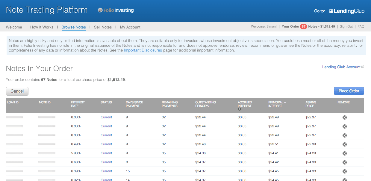 Above you see the Notes in your Order screen. By clicking on the Place Order button on the right, you have officially invested in notes on Lending Club’s Folio secondary market. Nice!