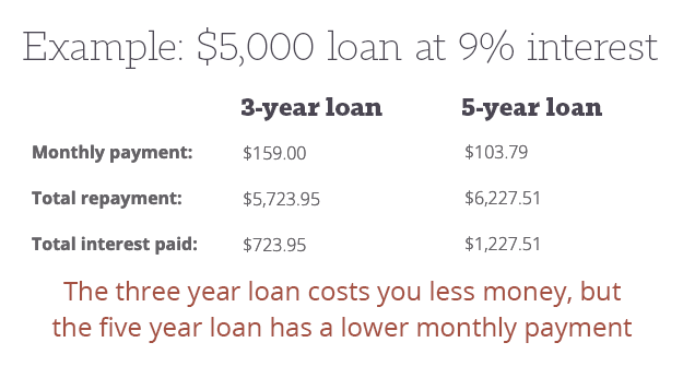 Secondly, think about increasing the “term” of the loan. The term is the length of time that you will borrow the money. For example, if you use LendingMemo’s loan calculator then you will see a 3-year $5,000 loan at 9% interest will have a monthly loan payment of $159. In contrast, a 5-year loan for the same amount ($5,000 at 9%) has a monthly loan payment of about $104, $55 less per month for the same loan: