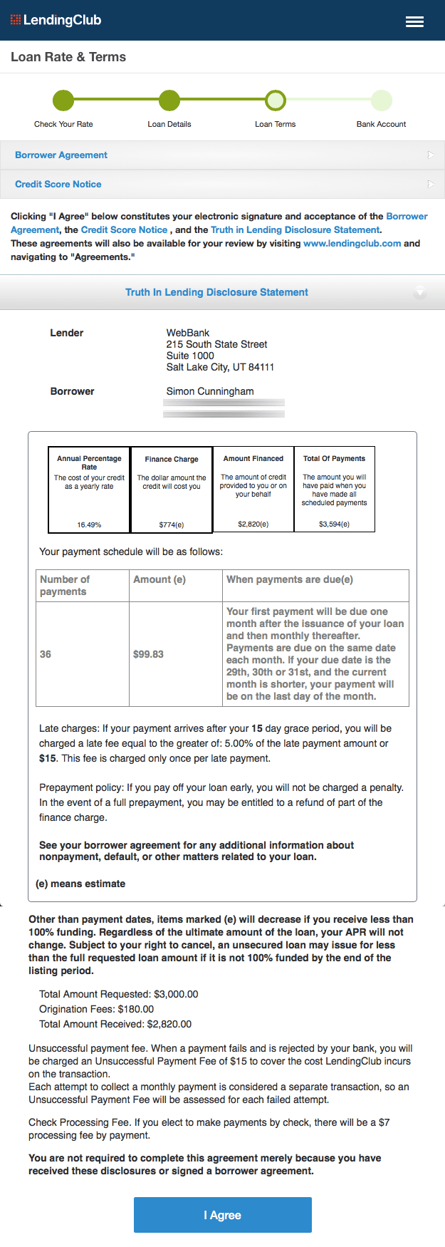 You will see everything listed on the Rate & Terms page: your loan amount, the fees you pay, everything. So make sure to take some time to read everything over carefully. This page is basically a legal document, so clicking the “I Agree” button is like adding your signature to the bottom of your loan application.