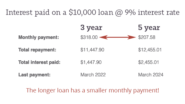 A second option is to increase the length of time that you pay back your loan from 3 years to 5 years. As seen in LendingMemo’s loan calculator, increasing the term increases the total amount of interest you pay, but it also lowers your monthly loan payment: