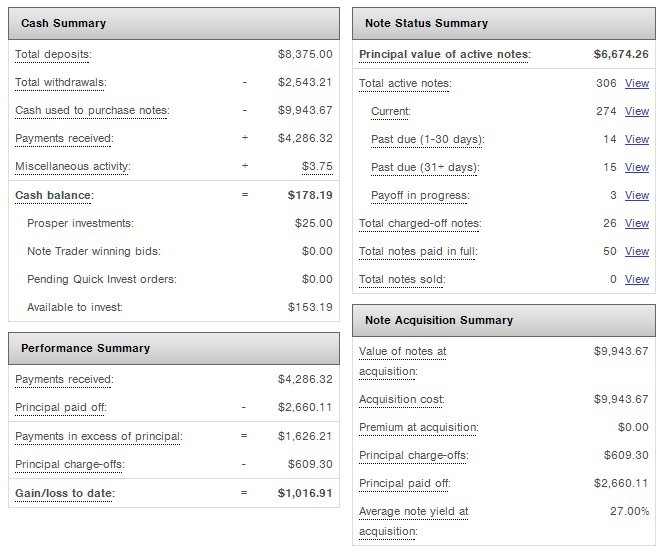 Looking to combat this trend, I hope to switch over to API investing myself in the coming months. Secondly, its important to restate that loan defaults peak at month 10. My Prosper account is also my youngest, with the average note age at nine months. I assume this ROI will drop a bit more in the coming quarter because of additional defaults (15 notes are 31+ days late), I believe things should even out at a 12% ROI by the end of the year.