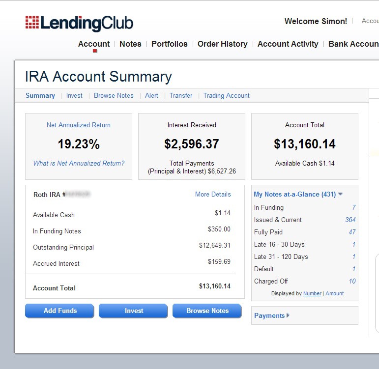 My Lending Club IRA similarly continues to do well, only investing in targeted E, F, & G grade loans via API. 83% of my notes are with 60-term (5 year) loans, so its makeup is a bit riskier than most lenders. I added $1,500 in new funds this quarter, mostly from closing my old Lending Club taxable account. The average interest rate for my 431 notes is a sexy 21.16%. This means I have lost about 7-8% through my 11 defaults or through selling discounted notes on Foliofn.
