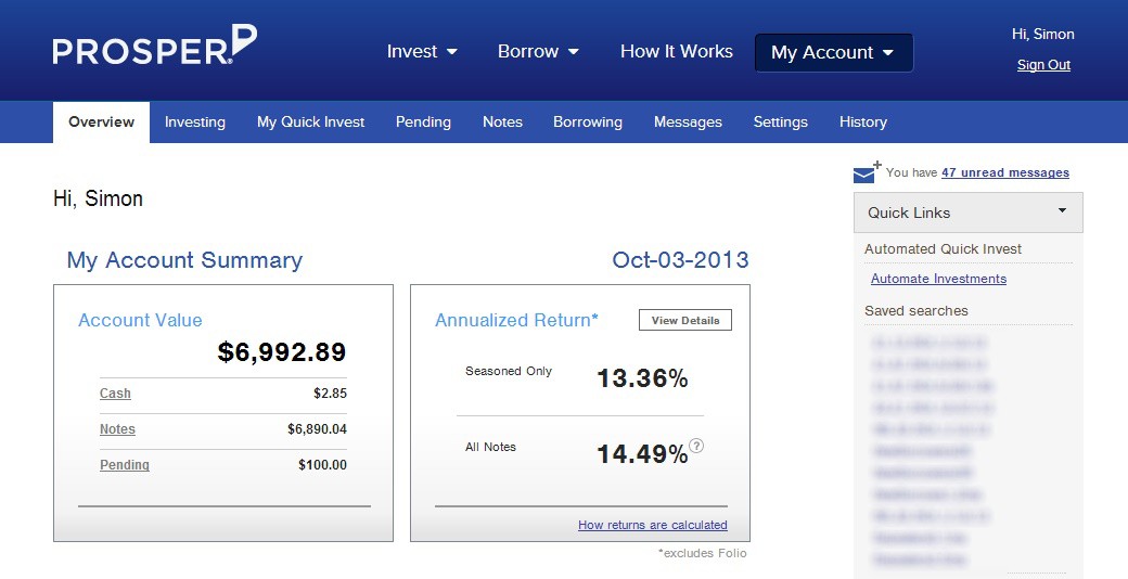 Last quarter (2013Q2) I was having trouble getting Prosper’s Automatic Quick Invest to find notes that matched my specific filters. This problem has been fixed by moving over to API investing, as seen in my $2.85 in available cash. My account only invests in D, E, & HR grade notes that meet filters developed on Prosper-Stats.com. I found it interesting this quarter that the “seasoned” ROI they gave me was actually below my real world XIRR calculation. Typically it is the other way around – the on-site calculation is usually too high.