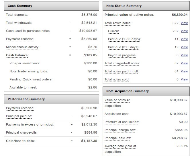 Furthermore, it is interesting to note that the average interest rate of the loans I invest in is 27%, yet I am only earning a 13% return. The reason for this difference is the 37 defaulted (charged-off) notes in the screengrab on the right. This is three times the number of defaults I had on my Lending Club account, evidence of the riskier borrowers I am lending to at Prosper.
